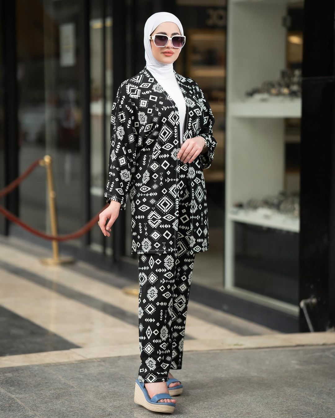 Featuring a contemporary tribal print in deep olive tones, this coordinated top and trouser set offers a refined yet relaxed silhouette. Its versatile design transitions seamlessly from casual daywear to evening gatherings.