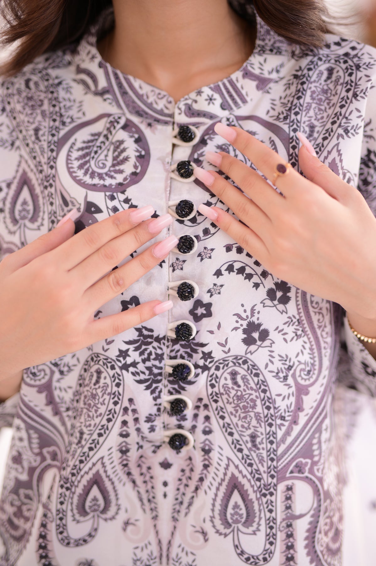Digitally printed with soft floral motifs and subtle design elements that add a fresh, graceful aura. The understated elegance makes this set a timeless wardrobe essential.