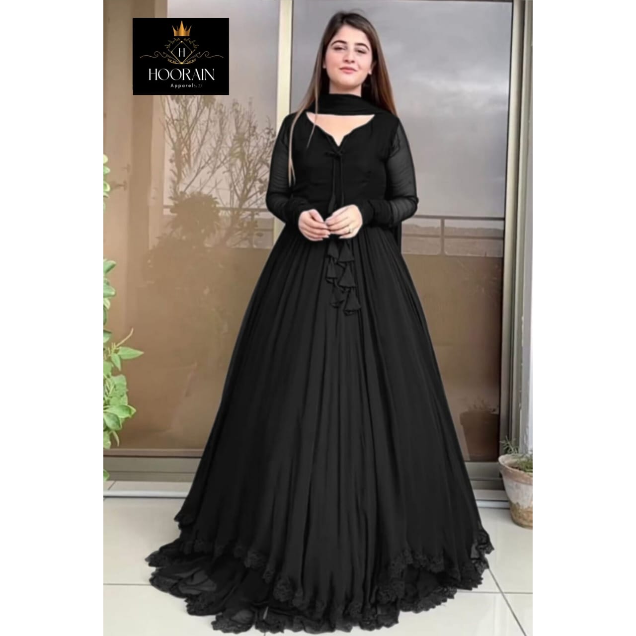 Indulge in the elegance of our Two Layers Border Front & Back Lace Work Long Flare Maxi with Dupatta 3pcs set. This ensemble is designed to make you stand out in every crowd.