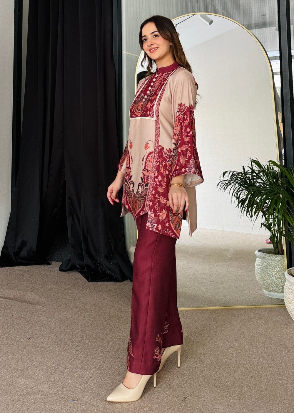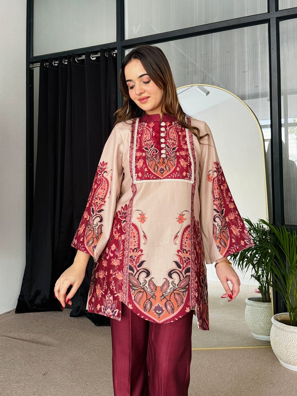 Turn heads with this mesmerizing maroon and beige outfit, designed to exude elegance and charm. The intricate digital print with artistic floral motifs adds a regal touch, perfect for festive occasions or semi-formal gatherings.