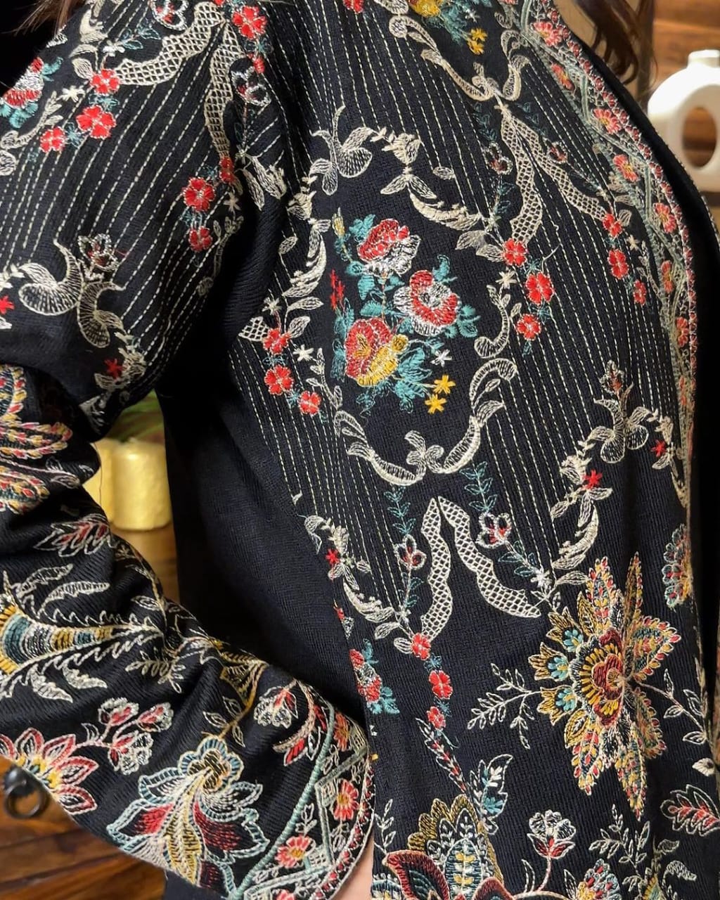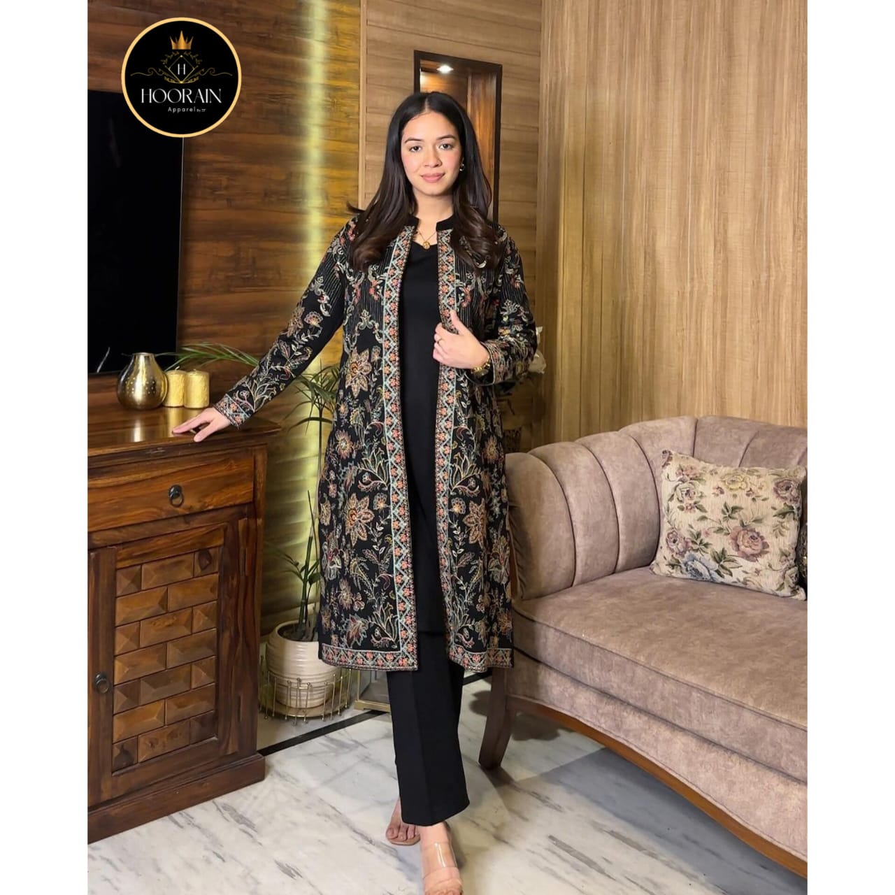 Experience opulence with our exquisite 3-piece set from Hoorain Apparel. This ensemble features a front full heavy embroidered gown paired with a sleeveless inner and trousers.