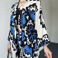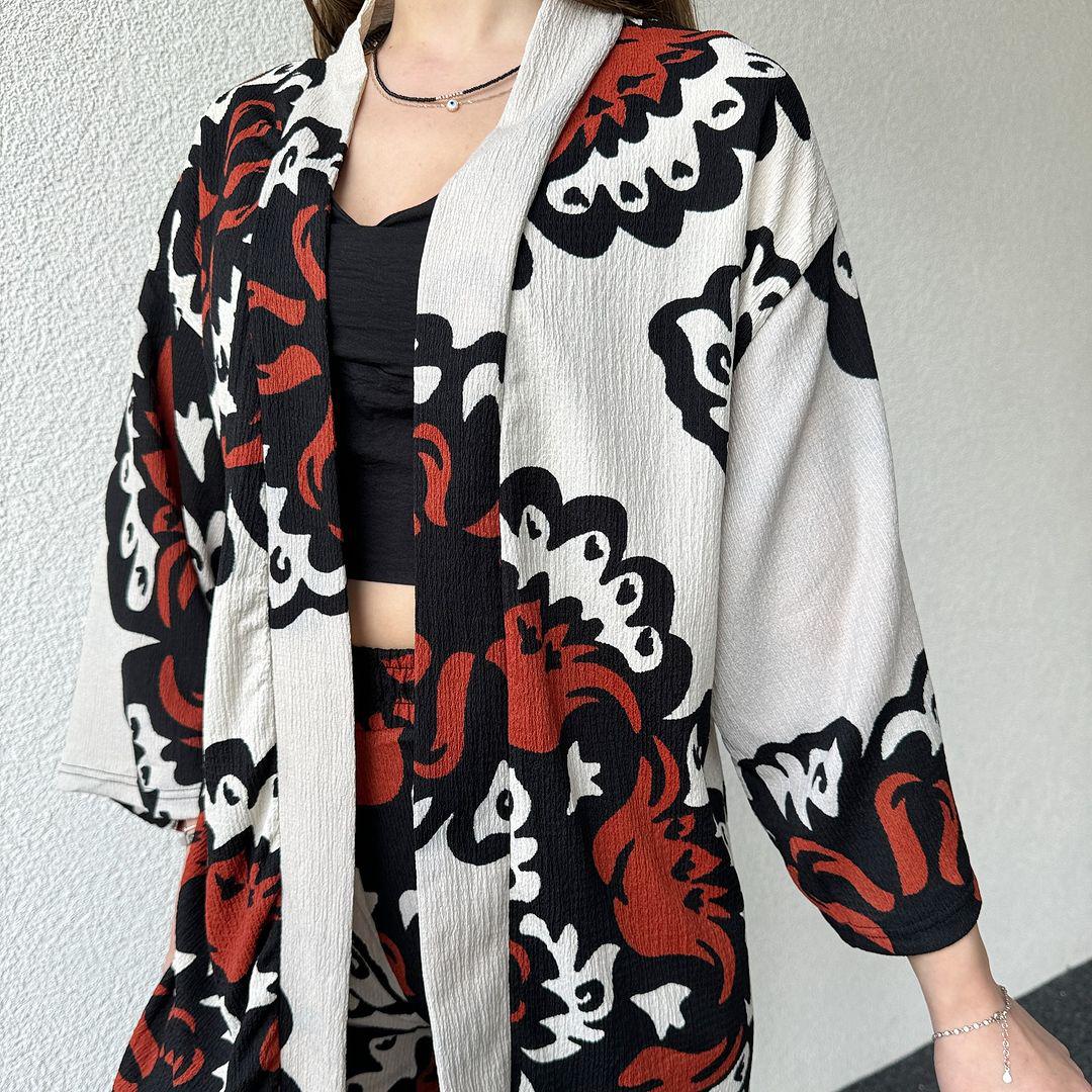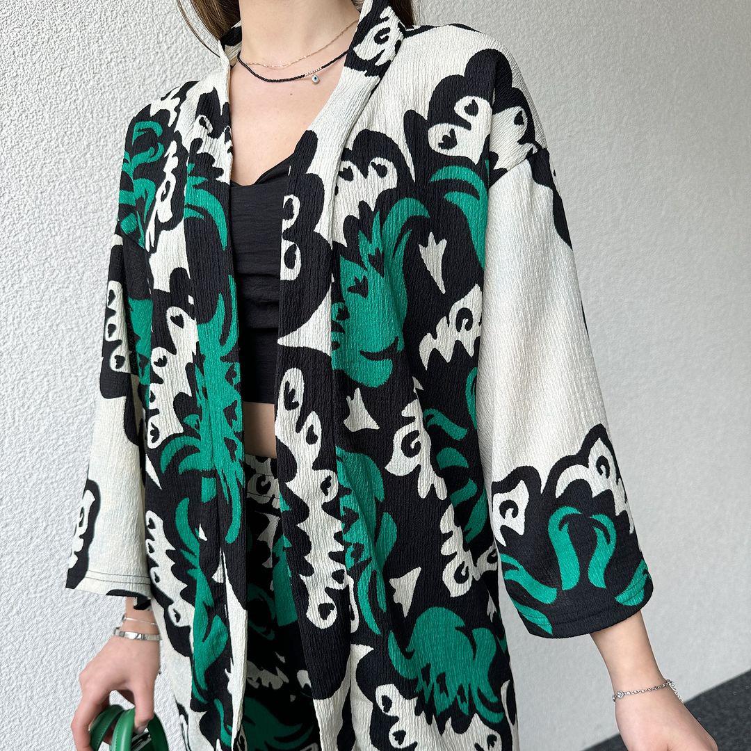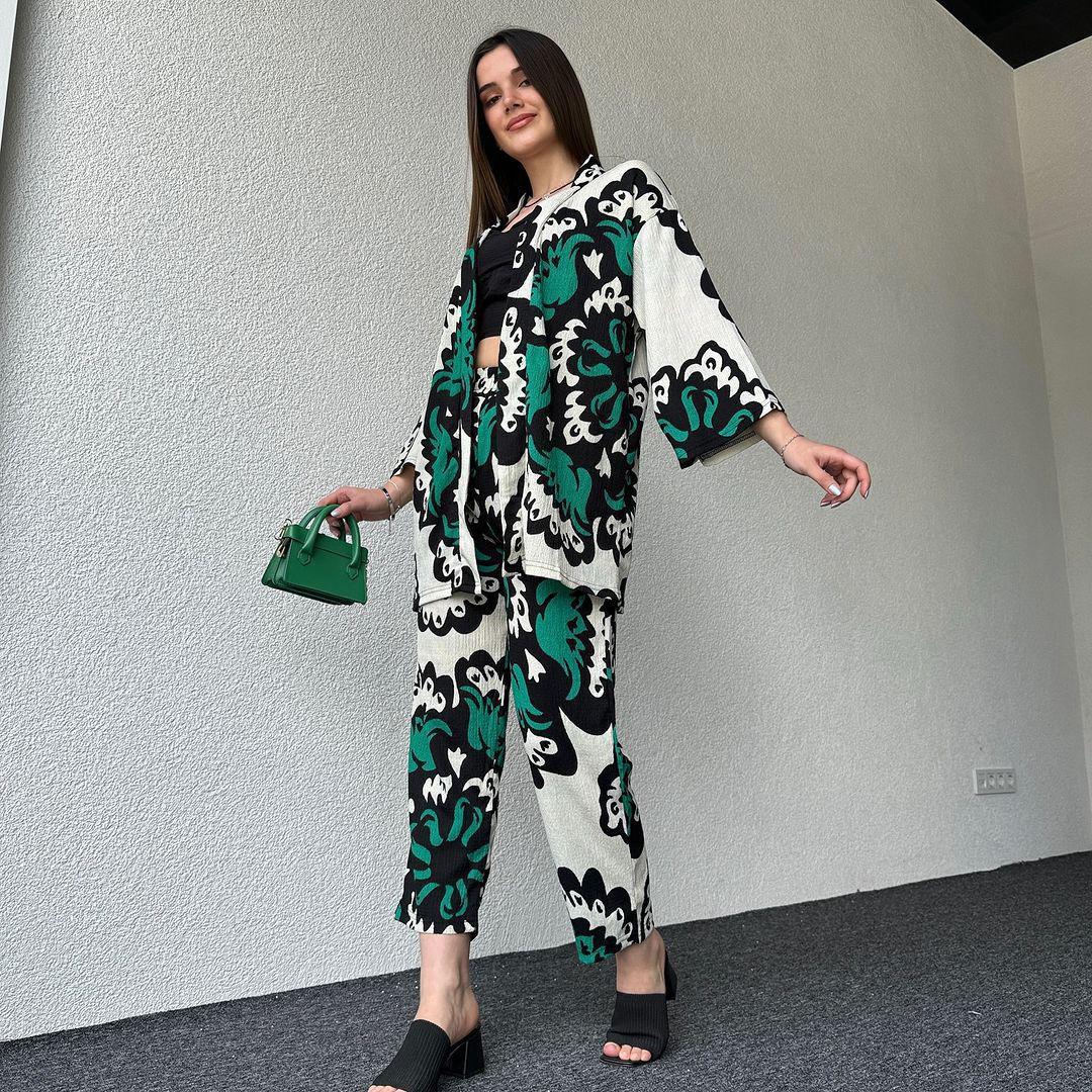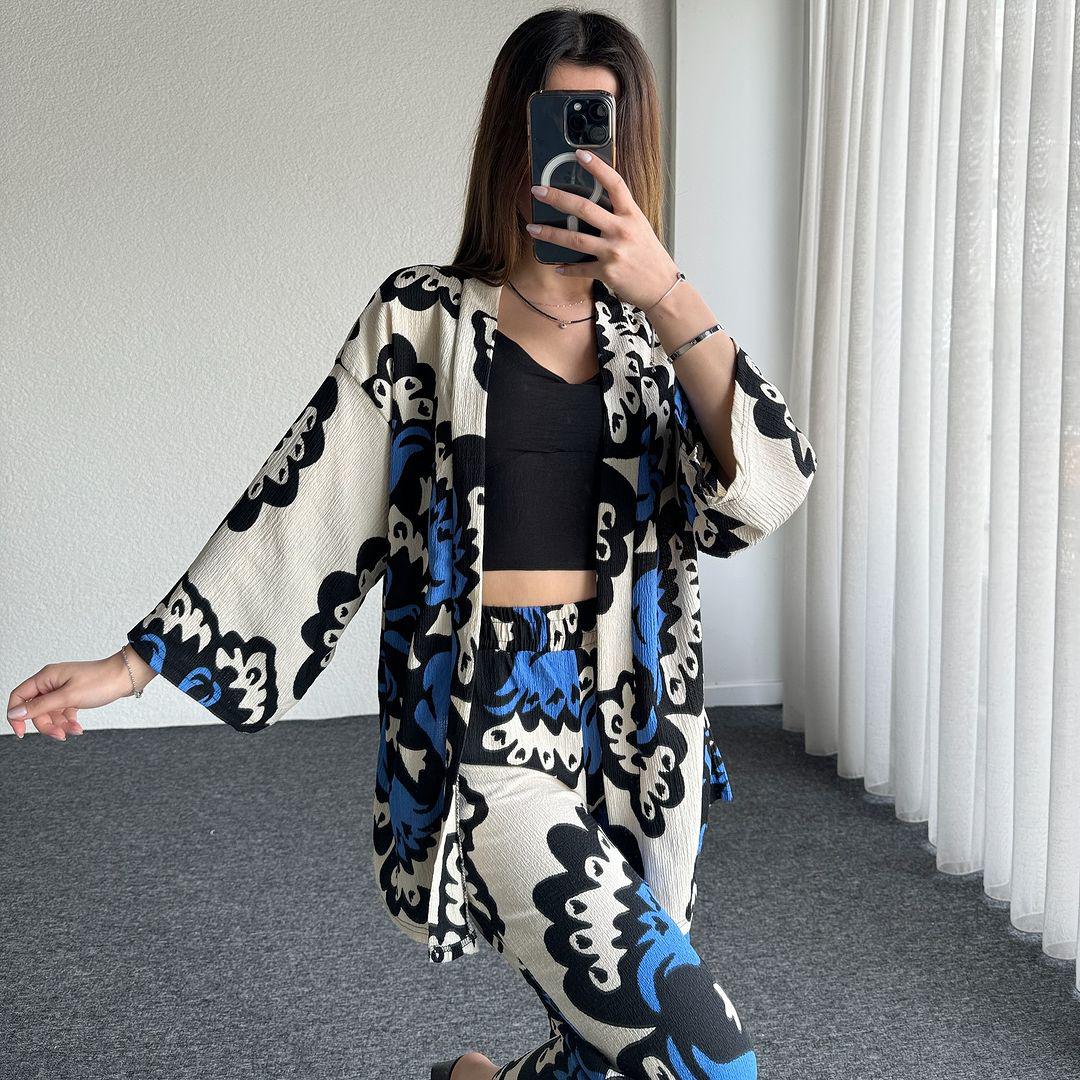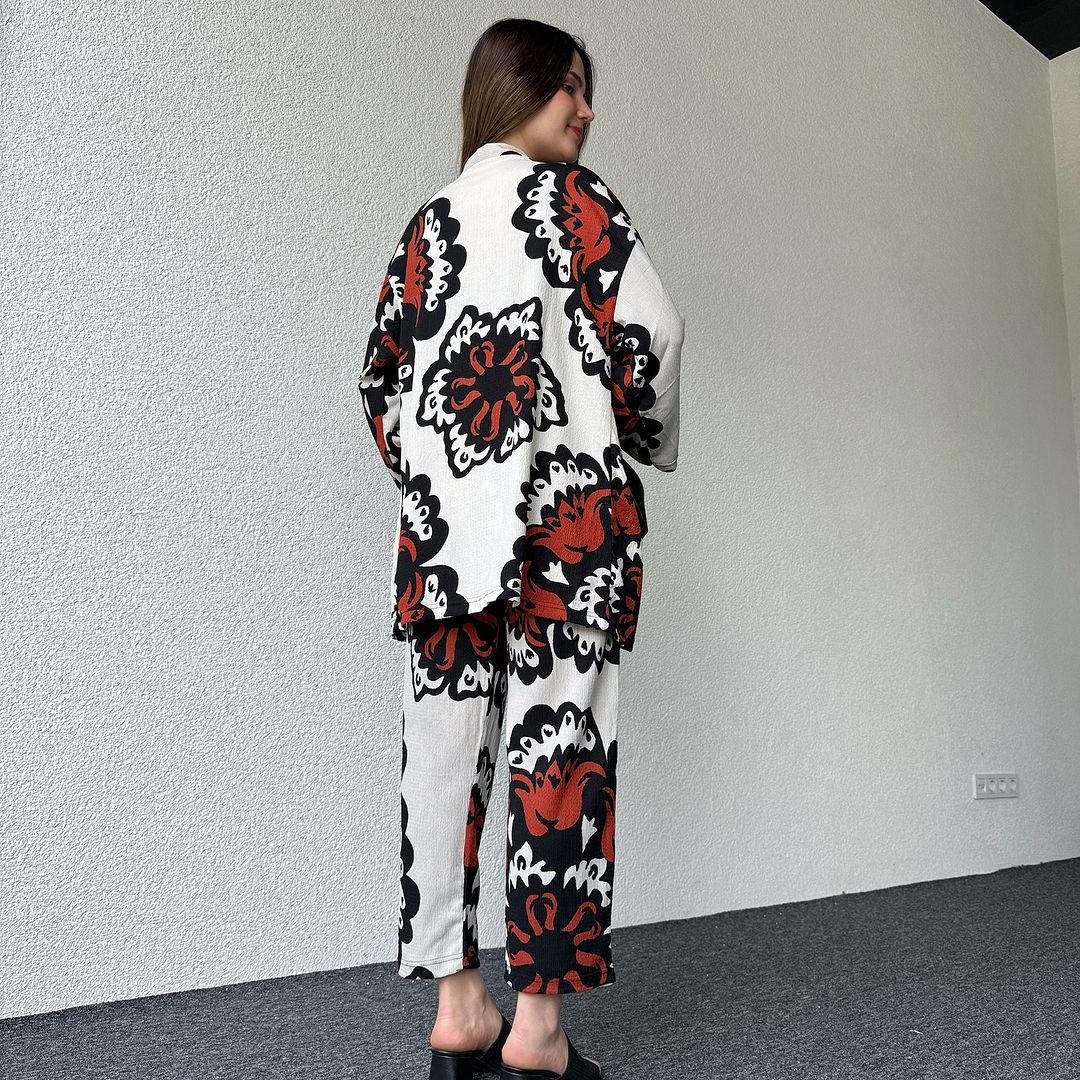 This kimono-style suit features wide sleeves, a clean neckline, and a loose, flowy silhouette. The understated pattern and minimalist cut make it a perfect fusion of comfort and modern aesthetics β great for casual get-togethers or relaxed formal settings.
