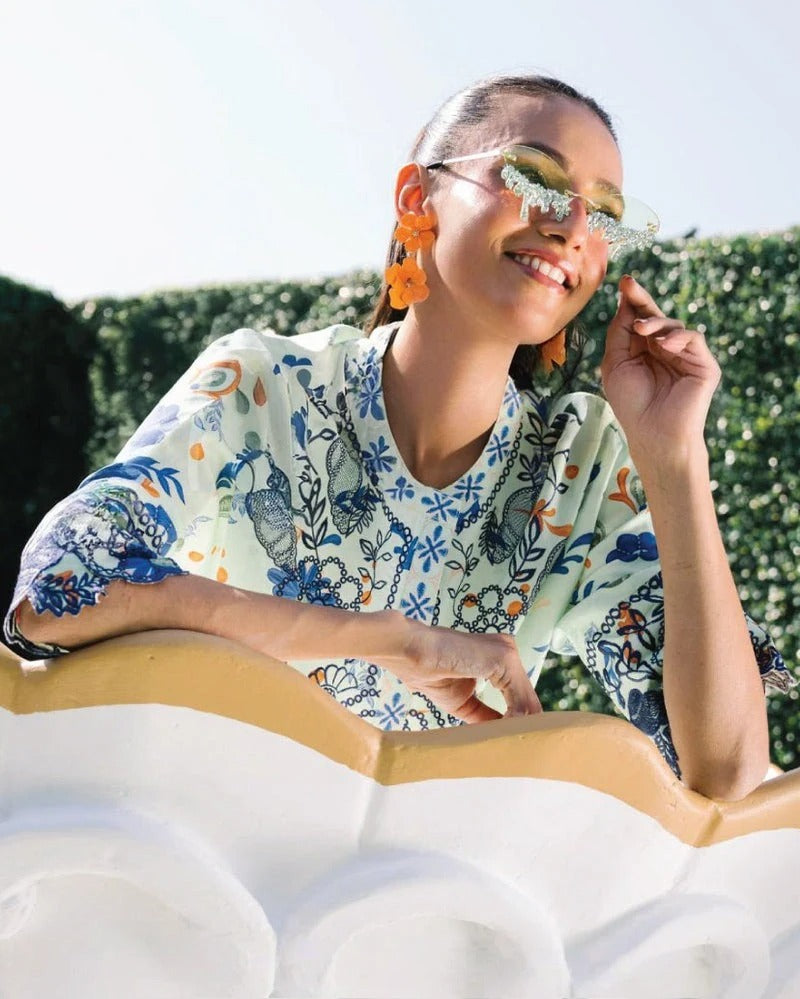 Digitally printed with soft floral and meadow-inspired patterns in refreshing mint tones, the design is playful yet elegant. It adds a gentle burst of color and charm, making it a delightful choice for daytime outings and casual gatherings.