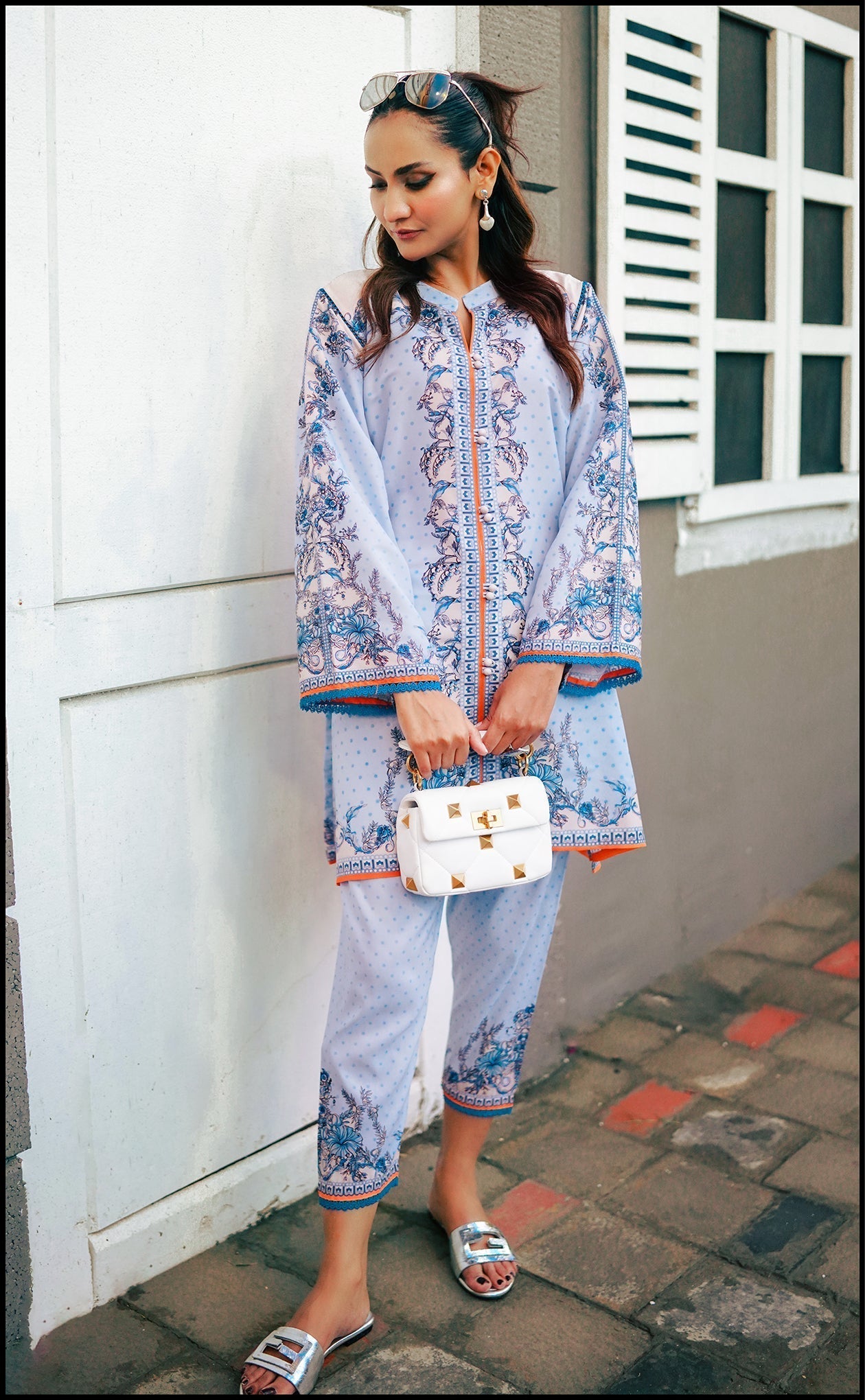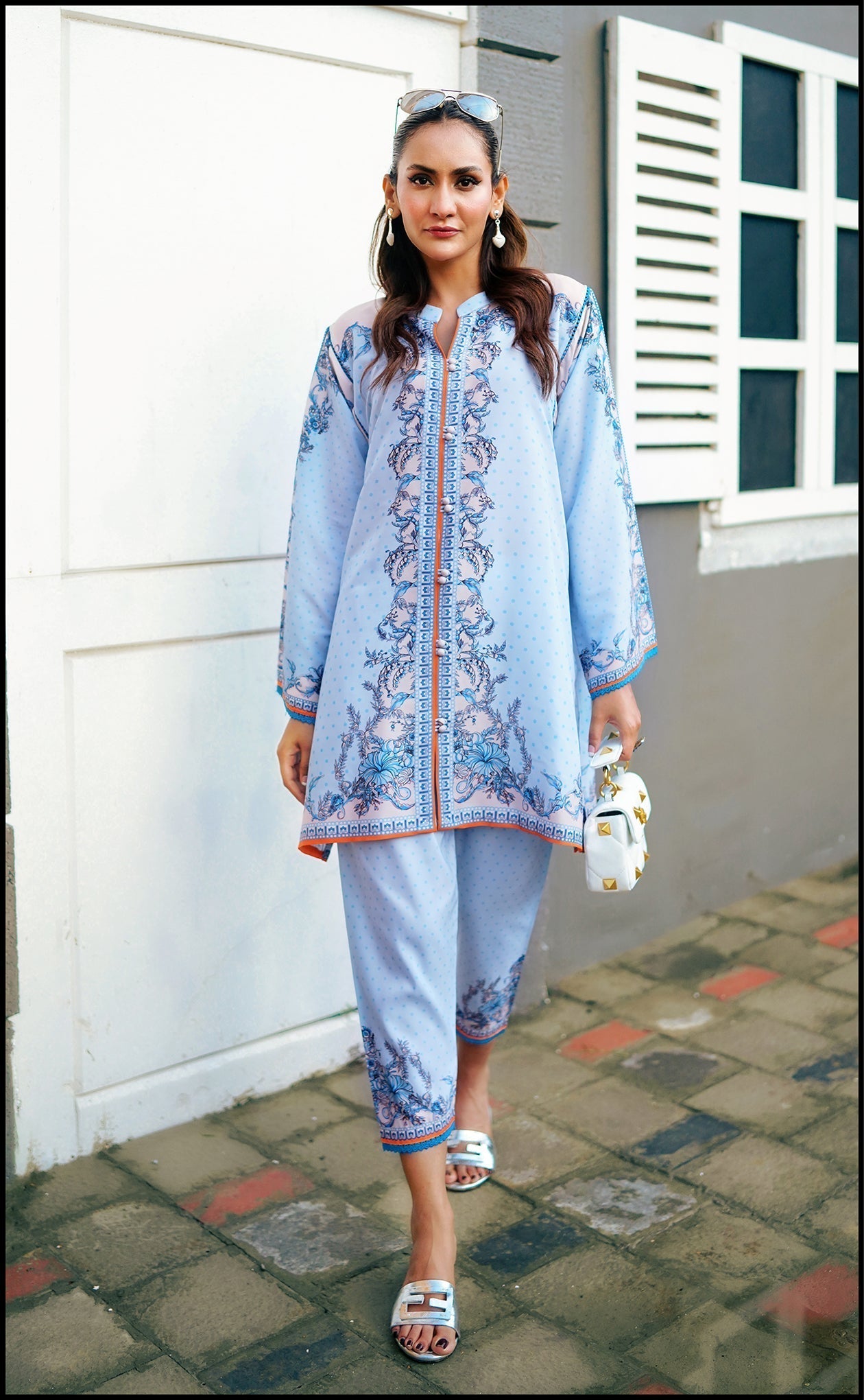 Digitally printed with graceful motifs in soft sky-blue hues, this design captures the essence of subtle elegance. Clean lines and balanced detailing make it an ideal choice for casual chic and semi-formal occasions alike.