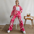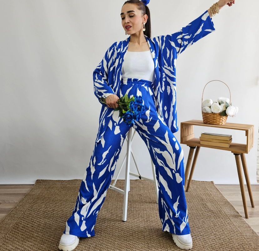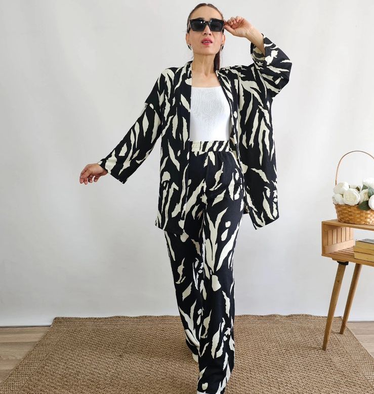 Featuring bold abstract patterns across a coordinated top and trousers, this set offers a modern silhouette with a relaxed yet tailored fit. Ideal for casual outings, brunches, or creative workdays.